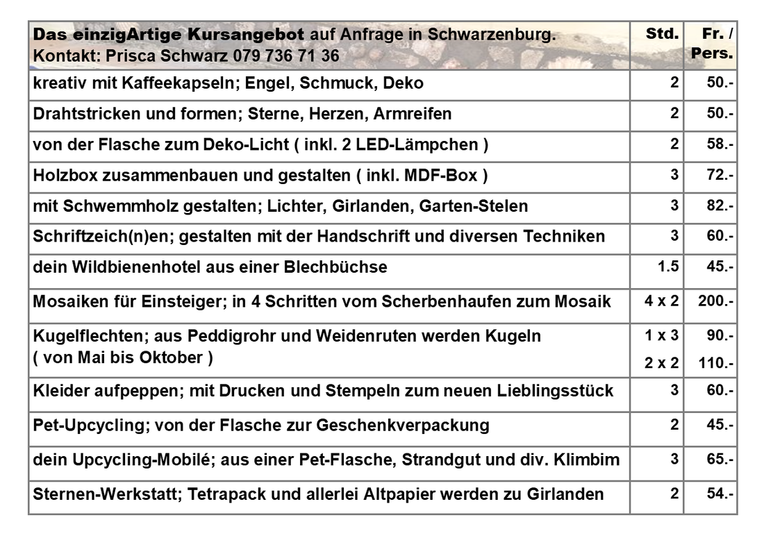 Leider stellte sich heraus, dass donnerstags quasi niemand Zeit hat, um mit einem Stand dabei zu sein. Über den Winter lassen wir das Thema Flohmi mal ruhen. Wer jedoch Interesse hat, im nächsten Frühling/Sommer dabei zu sein, darf sich gerne bei mir melden. Denn lieber günstig verkaufen als wegwerfen! In dem Sinne, beste Grüsse und bis bald. Prisca |